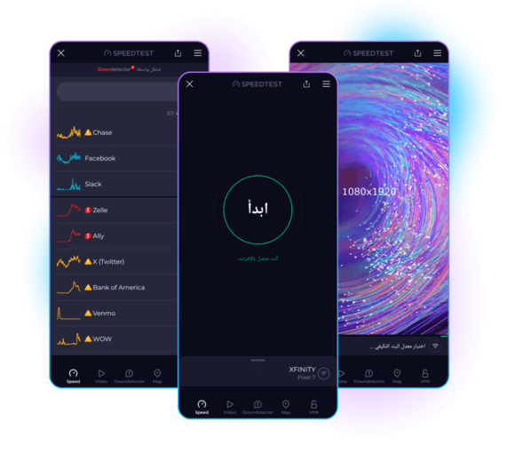 مهمتنا في Speedtest المقدمة من شركة Ookla® هي جعل الإنترنت أسرع من خلال توفير البيانات والرؤى حول سرعات الإنترنت الحقيقية حول العالم. مع مليارات الاختبارات من جميع أنحاء العالم، نعرفك ما هي تطبيقات الأجهزة التي تستخدمها أكثر من غيرها.